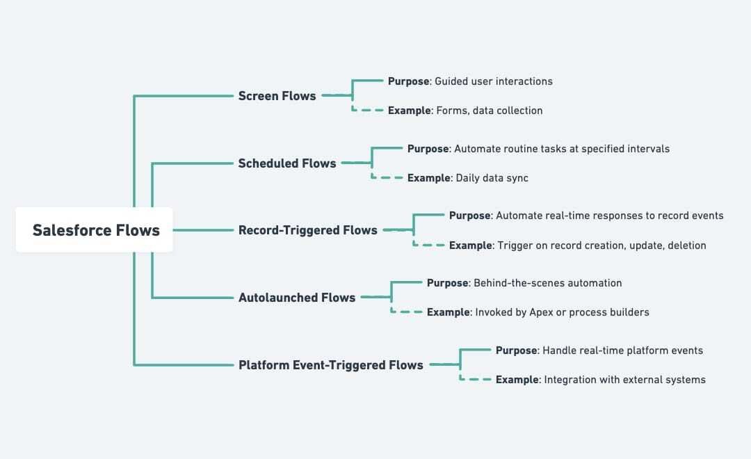 Salesforce Flows are ideal for automating repetitive tasks, managing complex workflows, and